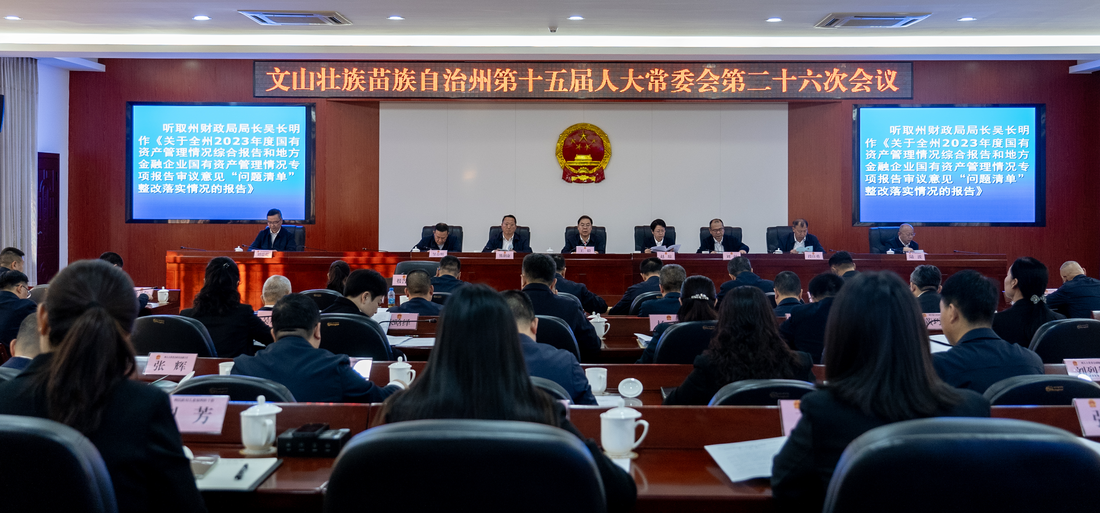 会议听取了《州人民政府关于全州 2023 年度国有资产管理情况综合报告和地方金融企业国有资产管理专项报告审议意见“问题清单”整改落实情况的报告》;审查了《州人大常委会跟踪监督组关于对全州2023年度国有资产管理情况综合报告和地方金融企业国有资产管理专项报告审议意见“问题清单”落实情况的监督报告(书面)》;听取了《州人民政府关于全州民族团结进步“十县百乡千村万户”示范引领建设工程情况报告审议意见“问题清单”整改落实情况的报告》;审查了《州人大常委会跟踪监督组关于对全州民族团结进步“十县百乡千村万户”示范引领建设工程情况报告审议意见“问题清单”落实情况的监督报告(书面)》;听取了《州人民政府关于全州推进卫生健康高质量发展情况报告审议意见“问题清单”整改落实情况的报告》;审查了《州人大常委会跟踪监督组关于对全州推进卫生健康高质量发展情况报告审议意见“问题清单”整改落实情况的监督报告(书面)》;听取了《州人民政府关于全州“一老一小”关爱服务工作情况报告审议意见“问题清单”整改落实情况的报告》;审查了《州人大常委会跟踪监督组关于对全州“一老一小”关爱服务工作情况报告审议意见“问题清单”落实情况的监督报告(书面)》;听取了《州人民政府关于全州法律援助工作情况报告审议意见“问题清单”整改落实情况的报告》;审查了《州人大常委会跟踪监督组关于对全州法律援助工作情况报告审议意见“问题清单”落实情况的监督报告(书面)》;听取了《州人民政府关于全州三七产业发展情况报告审议意见“问题清单”整改落实情况的报告》;审查了《州人大常委会跟踪监督组关于对全州三七产业发展情况报告审议意见“问题清单”落实情况的监督报告(书面)》;听取了《州中级人民法院关于全州法院审判监督工作情况报告审议意见“问题清单”整改落实情况的报告》;审查了《州人大常委会跟踪监督组关于对全州法院审判监督工作情况报告审议意见“问题清单”落实情况的监督报告(书面)》;听取了《州人大常委会主任会议关于提请审议王学祥同志免职的议案》《州人大常委会主任会议关于提请审议任命文山州第十五届人民代表大会常务委员会代表资格审查委员会副主任委员、委员的议案》《州人民检察院关于提请审议郑传达等六名同志职务任免的报告》。