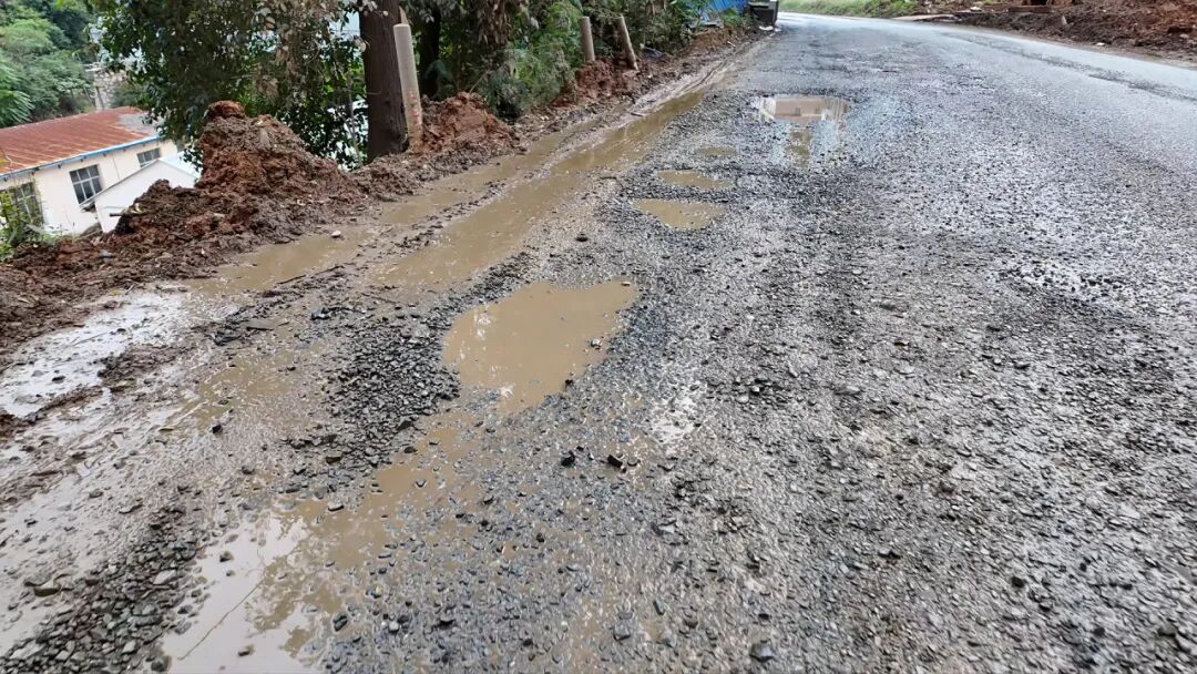经现场核查,该路段因重载车辆频繁通行,部分路面严重破损、坑洼连片。雨季时路面积水最深可达20余厘米,不少小车途经易刮擦底盘、涉水抛锚;晴天尘土弥漫、能见度低,给群众出行带来极大不便,安全隐患突出,亟需维修整治。