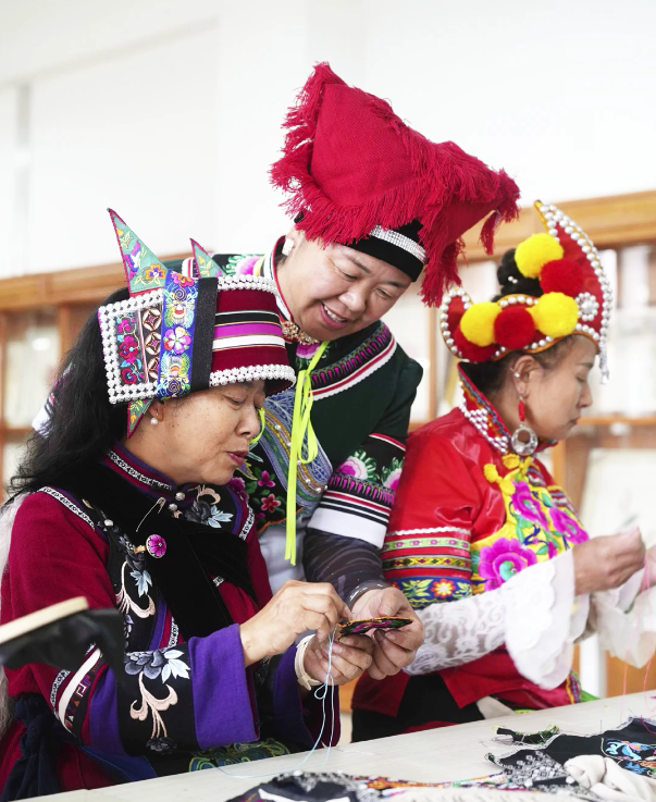 虽身着盛装走出乡土、走进北京人民大会堂,但王陆芬的心始终紧紧牵挂着家乡的山山水水和乡亲们。2013年,她放弃年收入超20万元的稳定水果生意,揣着积蓄返乡,从带领16名绣娘建起小绣坊起步,一步步探索出“协会+合作社+公司+电商+绣娘”的发展模式,让数千名妇女实现了“守着家、抱着娃、绣着花、养着家”的就业梦想,真正让“指尖记忆”转化为“指尖经济”。多年来,她不仅深耕彝绣产业,还持续开展“非遗进校园”、创业宣讲等活动,走进校园传授刺绣技艺、解读非遗文化,深耕乡村教育与文化传承一线,让彝绣文化在青少年心中落地生根。此次参会,她更是聚焦家乡发展痛点,为边境地区振兴、非遗产业提质增效积极发声、主动建言。